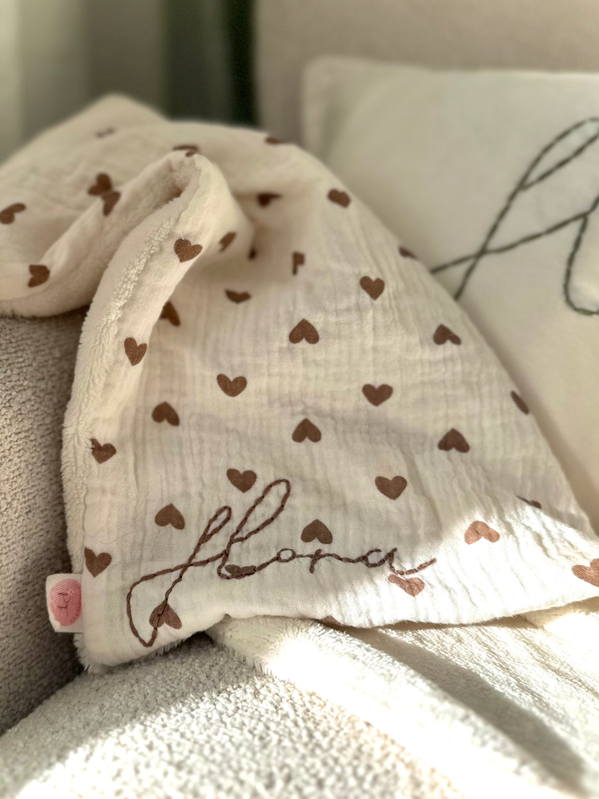 Disposés délicatement sur un fond beige chaleureux, ces petits cœurs bruns apportent une touche tendre et intemporelle. La broderie brune s’harmonise parfaitement à l’ensemble pour un rendu doux 🤎